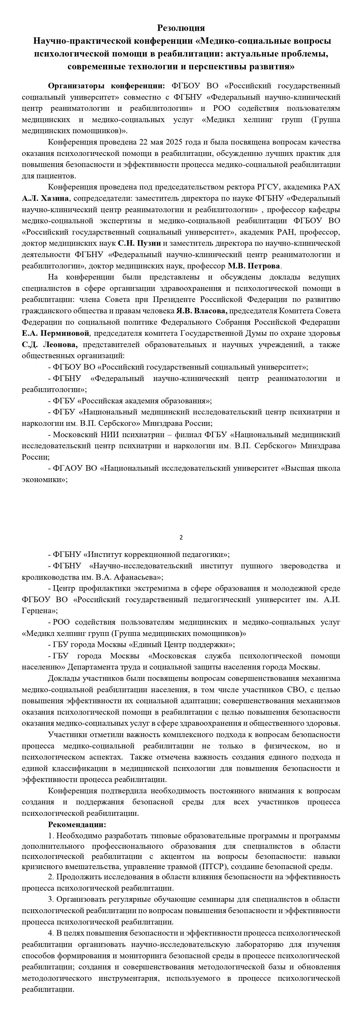 22 мая 2025 года в Российском государственном социальном университете состоялась научно-практическая конференция «Медико-социальные вопросы психологической помощи в реабилитации: актуальные проблемы, современные технологии и перспективы развития», которая организована в партнерстве с Федеральным научно-клиническим центром реаниматологии и реабилитологии и региональной общественной организацией «Медикл хелпинг групп (Группа медицинских помощников)».